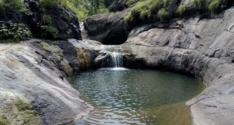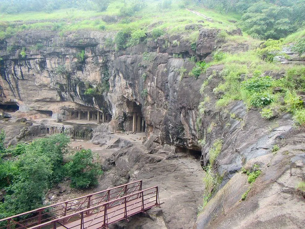 The Pitalkhora Caves, in the Satmala range of the Western Ghats of Maharashtra, India, are an ancient Buddhist site consisting of 14 rock-cut cave monuments which date back to the third century BCE, making them one of the earliest examples of rock-cut architecture in India. Located about 40 kilometers from Ellora, the site is reached by a steep climb down a flight of concrete stairs, past a waterfall next to the caves.